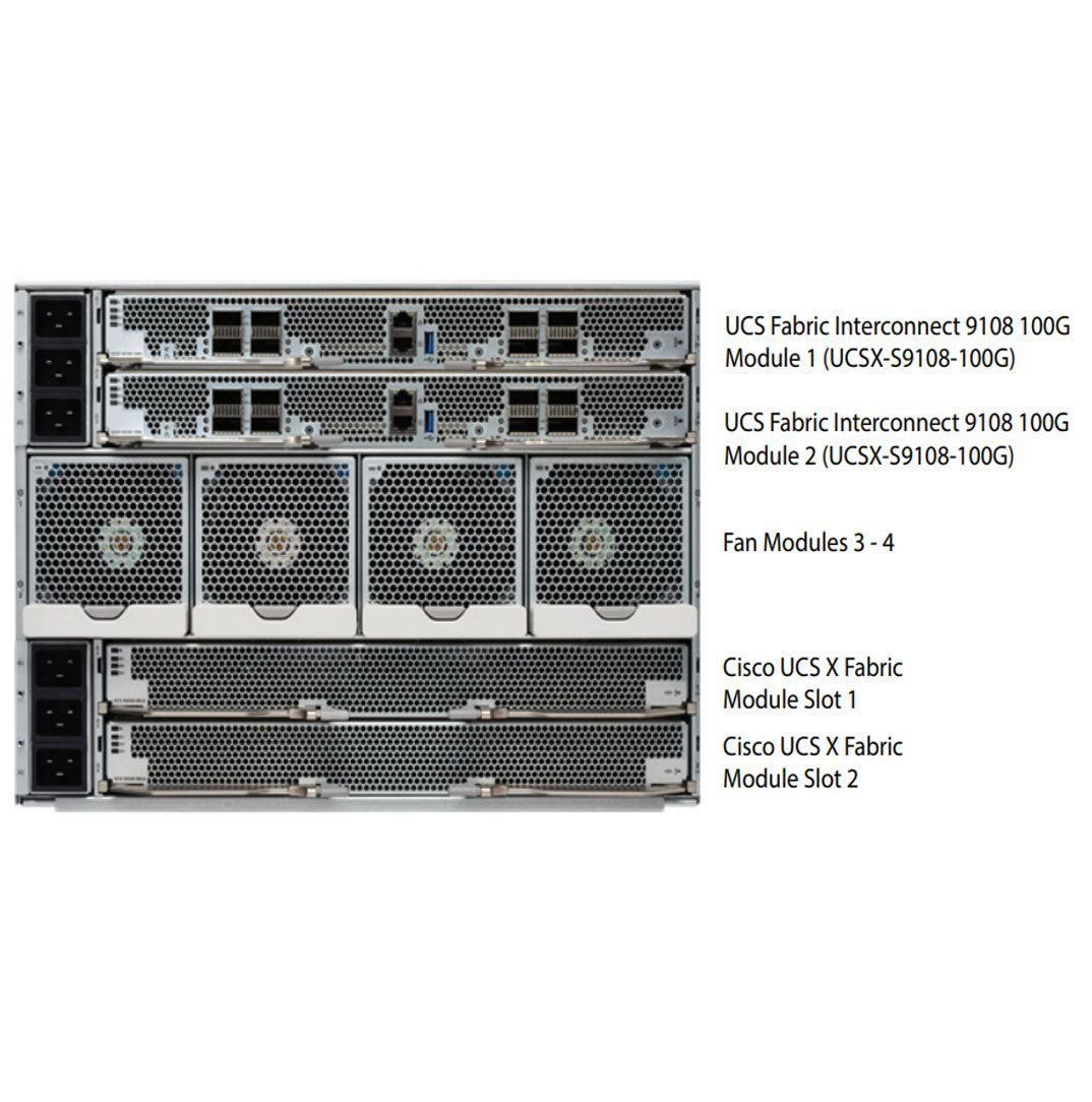 The Cisco UCS Fabric Interconnect 9108 100G (Figure 10) is an integrated 1/10/25/40/100 Gigabit Ethernet, FCoE, and Fibre Channel switch offering up to 1.6 Tbps throughput and up to 8 ports. The switch has 6 40/100-Gbps Ethernet ports and 2 unified ports that can support 40/100-Gbps Ethernet ports or 8 Fiber Channel ports after break-out at 8/16/32-Gbps FC speeds. The 8 FC ports after breakout can either operate as an FC uplink port or as an FC storage port. The switch supports 2 1-Gbps speed after breakout and all 8 ports can breakout for 10/25-Gbps Ethernet connectivity. All Ethernet ports are capable of supporting FCoE. Beyond the 8 external facing 100G ports, the Fabric Interconnect 9108 100G also provides eight 100G or thirty-two 25G backplane ethernet ports connectivity towards the X-series compute nodes depending on 100G or 25G VIC. The rear-view image shows the ortho-direct connectors that will connect to the VIC on the X-series compute node.