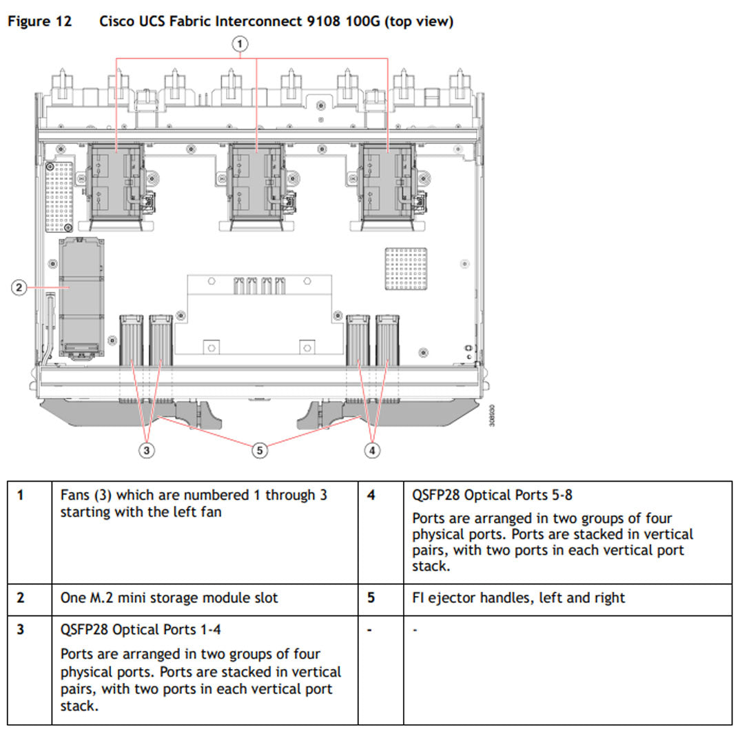 The Cisco UCS Fabric Interconnect 9108 100G also has one network management port, one console port for setting the initial configuration, and one USB port for saving or loading configuration.