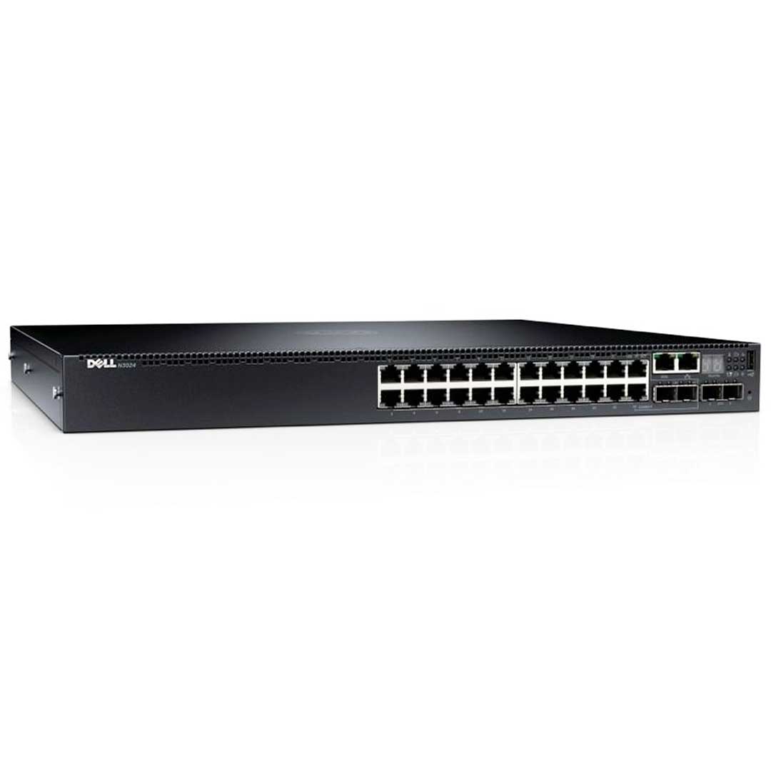 The Dell EMC PowerSwitch N3024 is a 24-port Layer 3 managed Gigabit switch designed to support scalable business networks. It features 24 1GbE ports, 2 combo GbE/SFP ports, and 2 dedicated 10GbE SFP+ uplinks for high-speed backbone or aggregation connectivity.