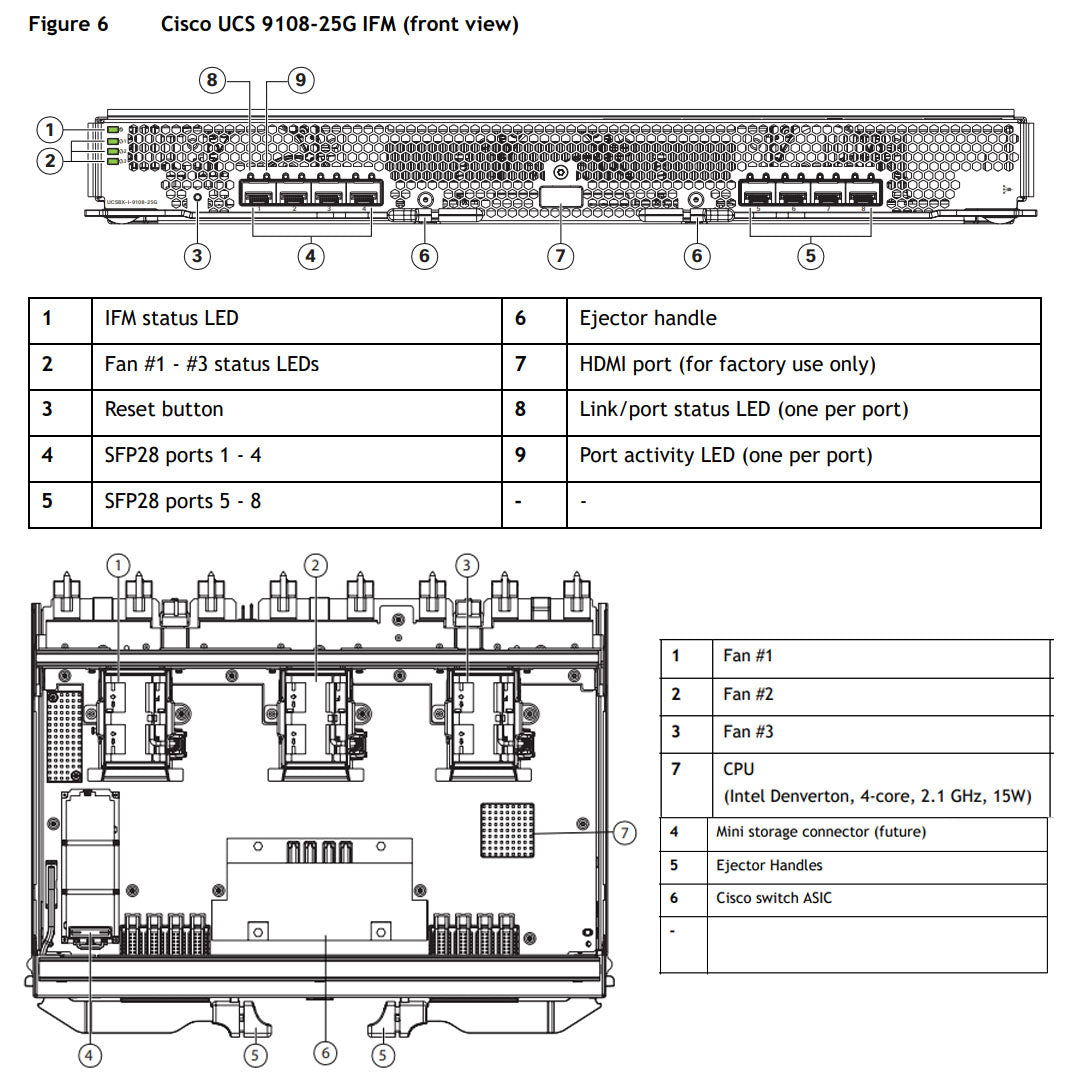 Each IFM features 8x SFP28 (25 Gbps) or 8x QSFP28 (100 Gbps) connectors, linking compute nodes to fabric interconnects. Compute nodes interface with IFMs via upper mezzanine cards (mLOMs) using orthogonal connectors. Supported configurations include UCS 9108-25G, 9108-100G IFMs, or Fabric Interconnect 9108 100G.