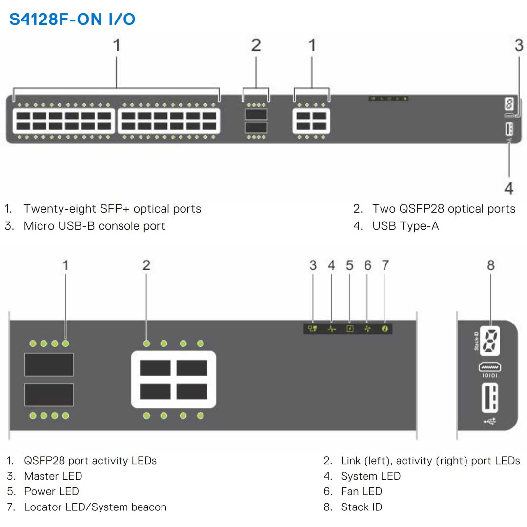 The Dell PowerSwitch S4128F-ON is a 960Gbps (full-duplex) non-blocking, cut-through switching fabric delivers line-rate performance under full load.