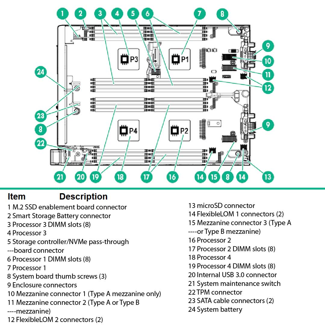 • Maximum (4 Processors, 2 FlexibleLOMs, 32 DIMMs, 4 hard drives, 3 mezzanine cards, and 1 flash cache batteries installed):